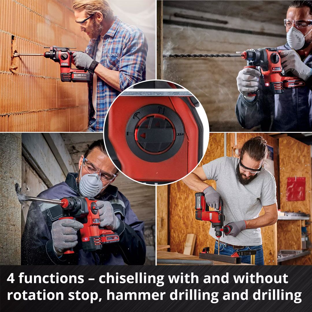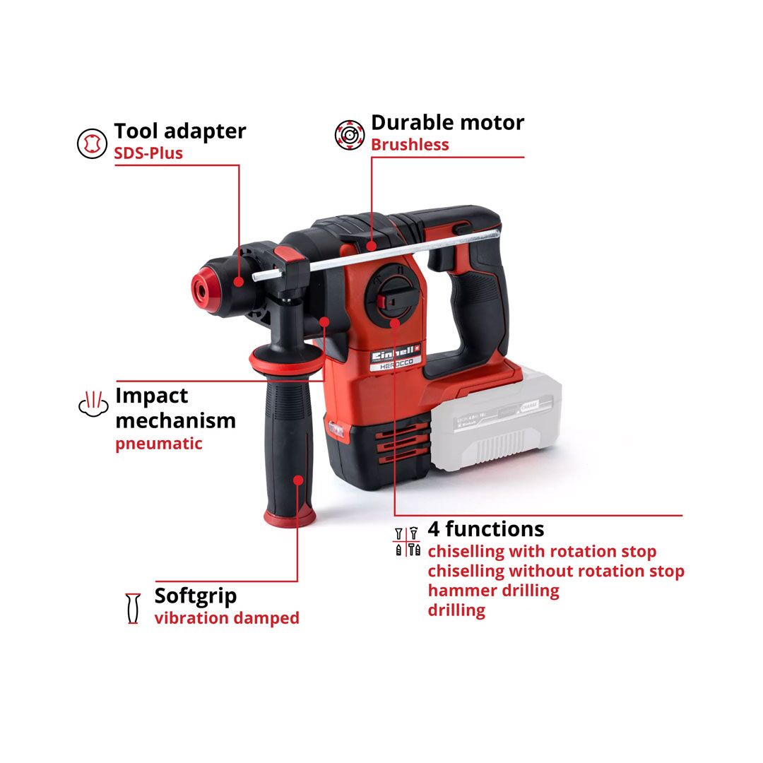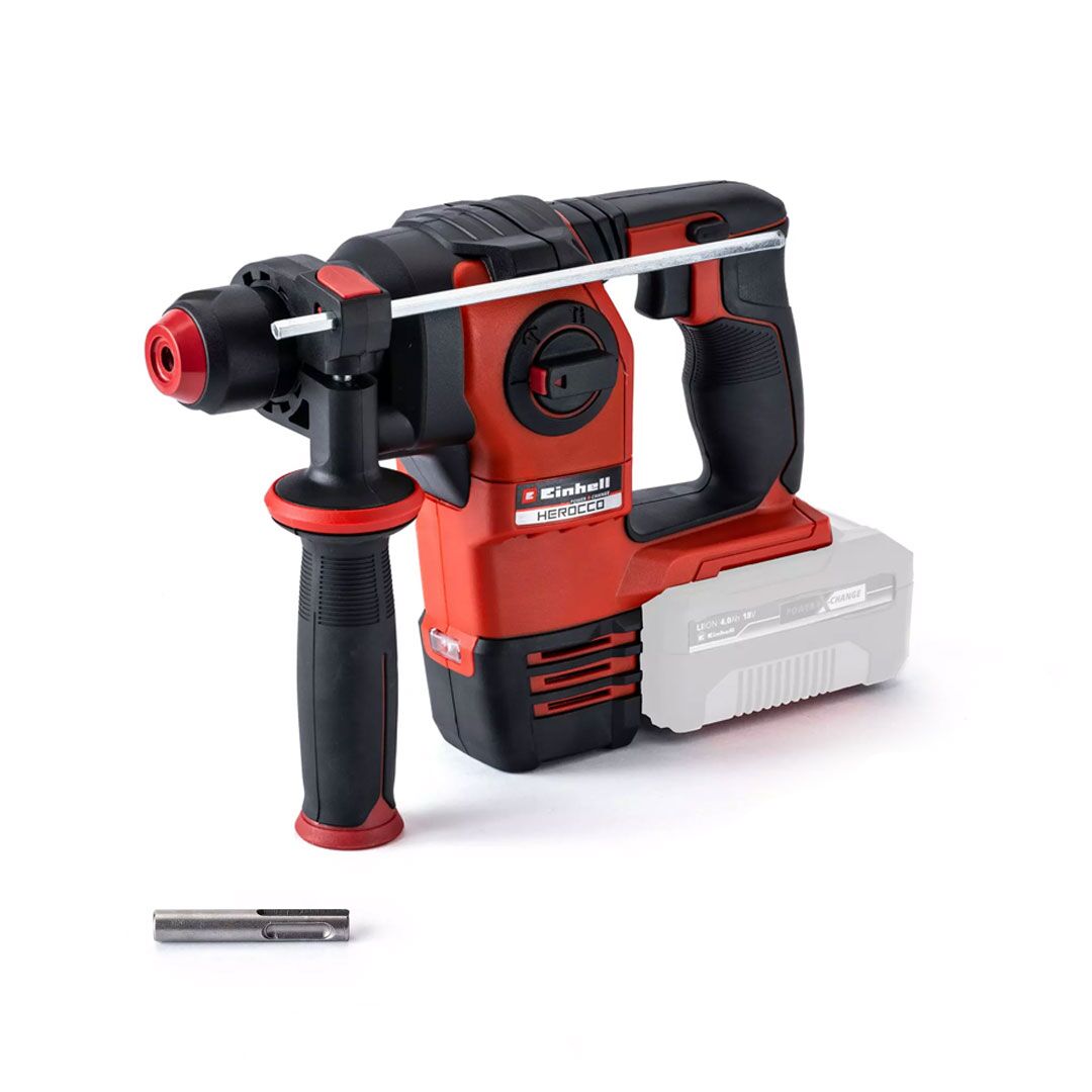 With its reliable performance, the HEROCCO 18/20 Einhell cordless rotary hammer is a sought-after all-rounder around the house, workshop and garden. When chiselling, tiles and bricks don’t stand a chance against the power of the HEROCCO 18/20. And even concrete and granite cannot withstand its drill