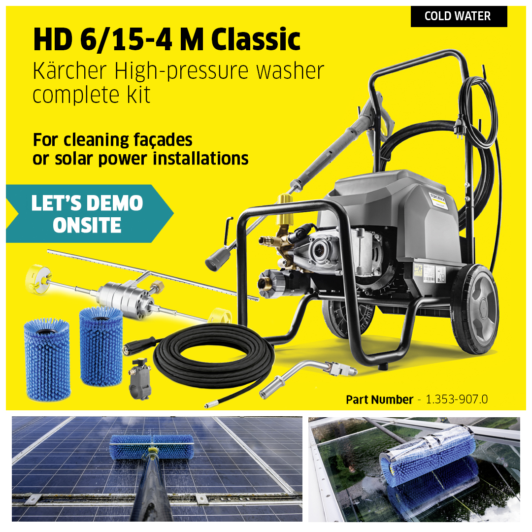 This all-inclusive Kärcher Solar cleaning kit consists of the HD 6/15-4 M (uses cold water only) washer. Hydraulic drive for rotating roller brushes – for cleaning façades or solar power installations with our professional high-pressure cleaners. Installation on spray lance or telescopic lance. Roller brush 500 – soft brush attachment for use with hydraulic drive, ideal for glass and solar power installation cleaning. Easy, quick-change system and secure mounting on the drive. Vario Joint – Attached to a telescopic lance from Kärcher, this Vario joint with flexible angle is the ideal addition to our roller brush 500 for cleaning solar panels. Telescopic lance 10m – Telescopic lance TL 10 F with up to 7 m reach made from robust and lightweight glass fibre. With practical, quick-release fasteners for simple retraction and extension. TL low-pressure adapter – TL low-pressure adapter comprising a ball valve for tool-free installation on telescopic lances. Ideal for applications with rotating high-pressure brushes. Hose solar 11,5m – High-quality, flexible HP hose (with rubber covering) for the iSolar TL 10. The outer layer has especially good sliding properties when extending and retracting the telescopic rod. Adapter 2 M22IG-TR22AG – Adapter 2 to connect the old device with the new hose and the old gun with the new hose.