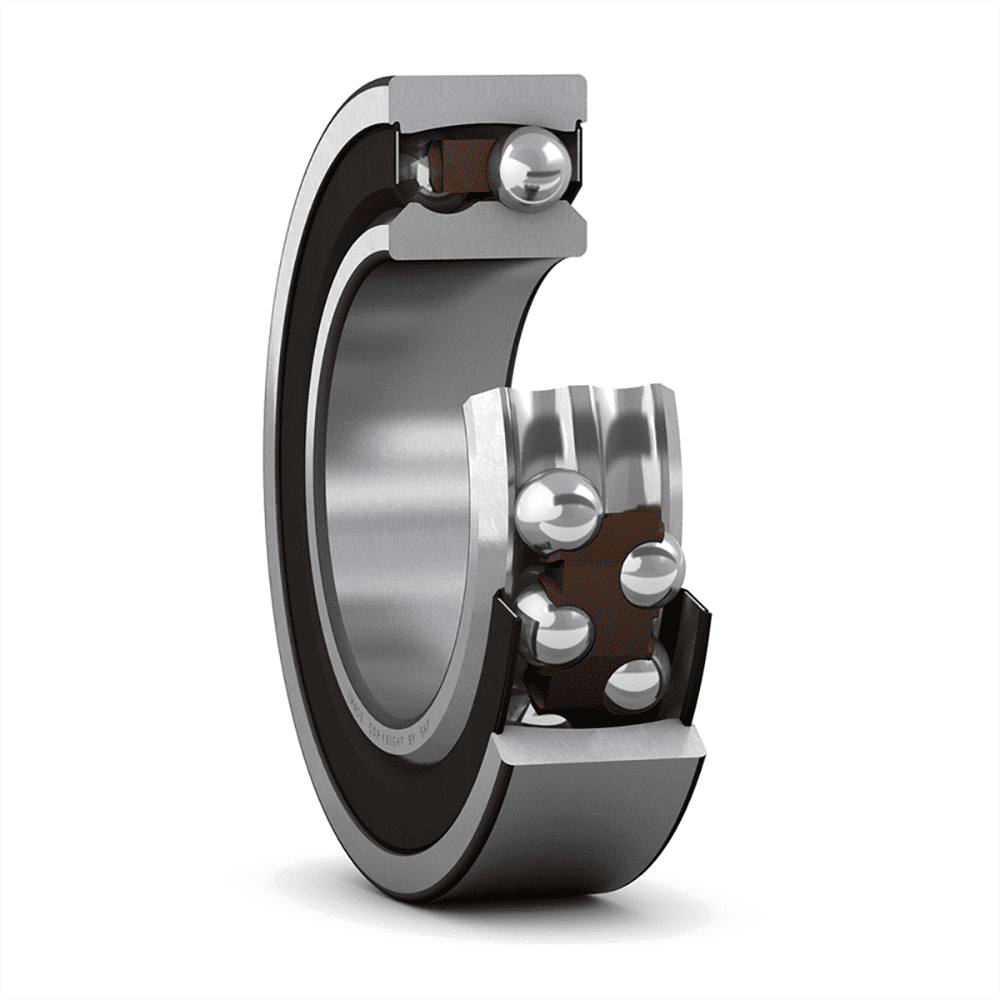 Self-aligning ball bearings have two rows of balls, a common sphered raceway in the outer ring and two deep uninterrupted raceway grooves in the inner ring. They are available open or sealed. The bearings are insensitive to angular misalignment of the shaft relative to the housing, which can be caused, for example, by shaft deflection.